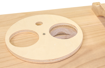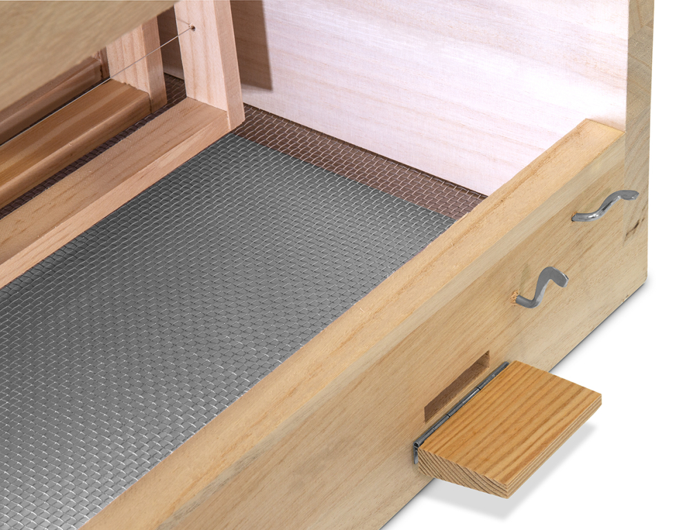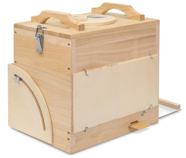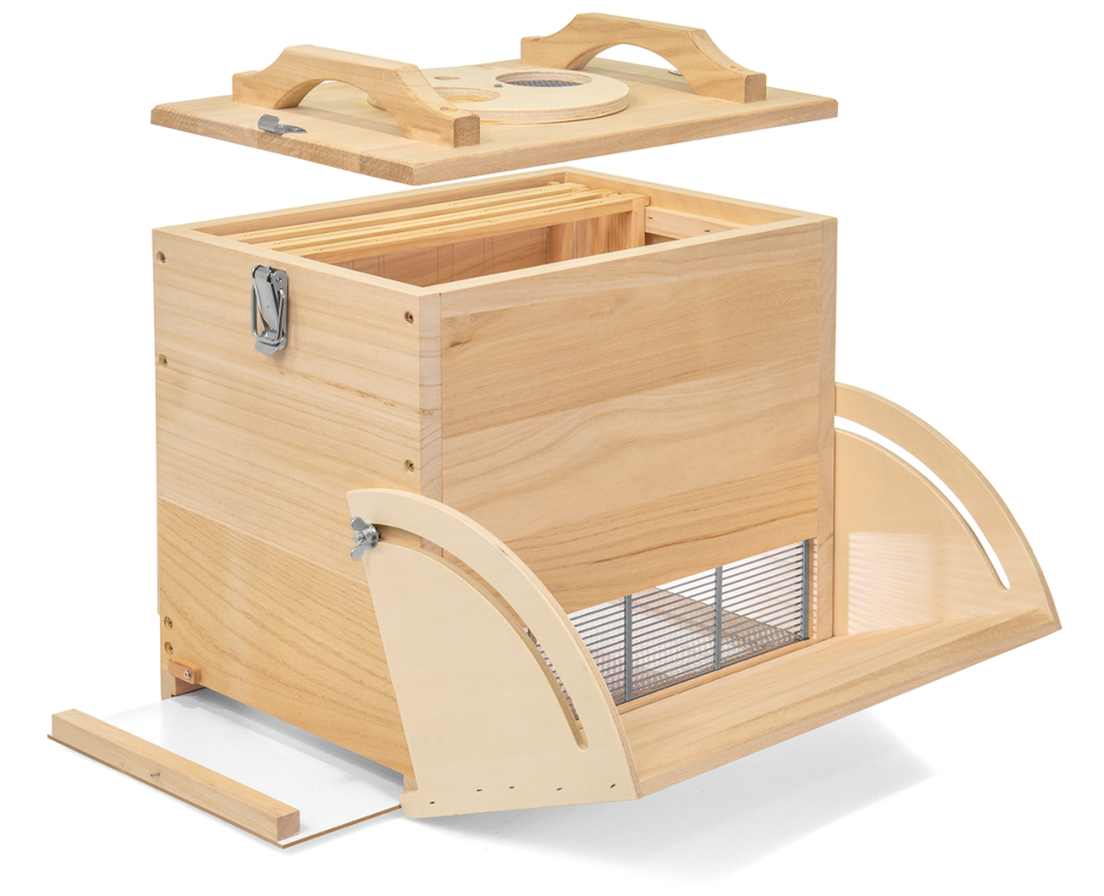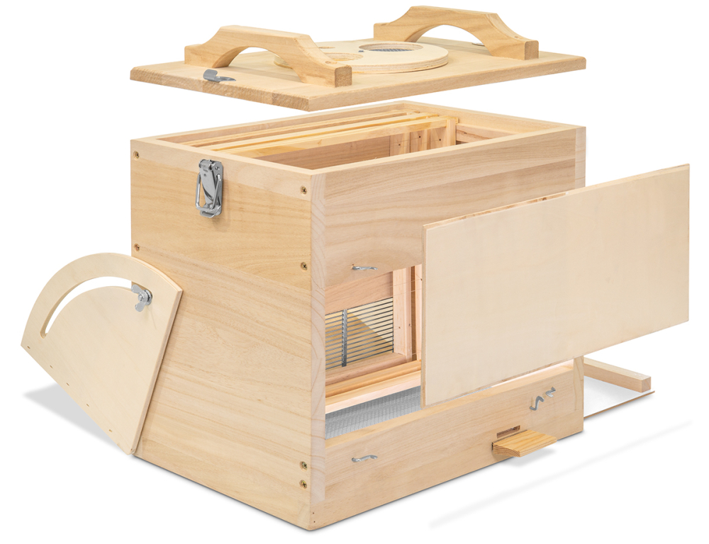 für 7 Rähmchen Normalmaß Anderthalb. Mit Lüftungs- und Varroagitter, Bodenschieber und Einlaufschütte mit Absperrgitter. Auf der Rückseite befindet sich zusätzlich eine große, abnehmbare Klappe. Der Deckel verfügt über einen Rundschieber mit Trichteröffnung oder Belüftung sowie über zwei Tragegriffe. Größe ca. 46 x 33 cm, Höhe 45 cm