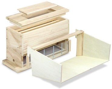 für 4 Rähmchen Zander. Der "Vater" der Feglingskasten nach Pfefferle. Handlicher Feglingskasten mit Lüftungs- und Varroagitter, Bodenschieber, abnehmbarer Einlaufschütte, Absperrgitter und Deckel mit Futtertrog zur Aufnahme von Festfutter. Besonderheit: Wird das Absperrgitter mit der seitlichen Verschlussklappe getauscht, verwandelt sich der RuckZuck vom Feglings- zum Ablegerkasten Größe 55 x 20 cm, Höhe 33 cm