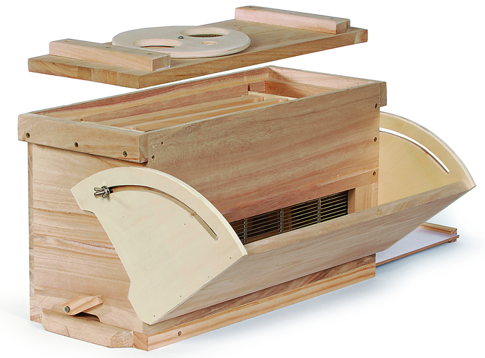 Schwarm- und Drohnen-Siebkasten für 5 W Normalmaß oder Zander, mit Einlaufschütte, Futterkammer, Bodenlüftungsgitter mit Varroaschieber und Deckel mit Rundschieber. Größe 60 x 26 cm, Höhe 35 cm