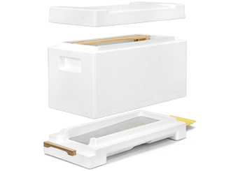 Hergestellt aus bis zu 4 cm starkem Hartpor-Styropor® und passend für bis zu 5 Rähmchen Normalmaß von 394 x 223 mm. Die Zargen sind stapelbar wie bei einem Magazin und zum Überwintern geeignet. Der Clou: Durch den herausnehmbaren Falzeinsatz können zwei Vertikal Halbzargen nebeneinander wie eine Segeberger Ganzzarge für rückenschonendes imkern verwendet werden.