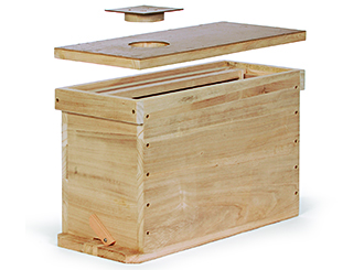 für 5 Rähmchen Dadant Blatt 470 x 300 mm oder ZaDant 477 x 285 mm. Mit verschließbarem Flugloch und Spundloch im Deckel, gefertigt aus Vollholz mit Hartfaserdeckel. Außenmaß 55 x 25 cm, Höhe 38 cm Gewicht ca.5 kg