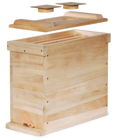 für 5 Rähmchen Normalmaß Anderthalb, mit verschließbarem Flugloch, zwei Spundlöchern im Deckel, sowie vorder- und rückseitigen Trageleisten. Komplett aus Vollholz Außenmaß ca. 48 x 23 cm, Höhe 43 cm Gewicht ca. 5 kg