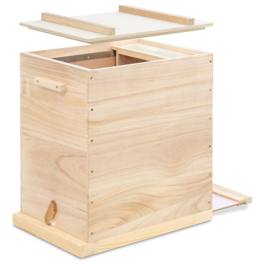 für 15 Rähmchen 327 x 459 mm, hergestellt aus 20 mm starkem Holz. Mit Edelstahl-Lüftungsgitter, Edelstahl-Auflageschienen, zwei Griffen sowie zwei verschließbaren Fluglöchern. Zusätzlich mit Varroa-Schieber Außenmaß ca. 47 x 35 cm, Höhe 56,5 cm, Gewicht ca. 8 kg