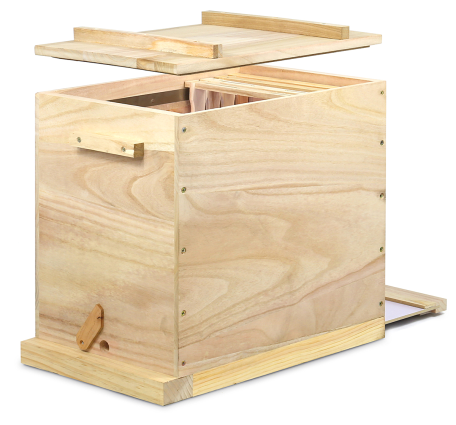 für 12 Rähmchen Kuntzsch-Hoch, hergestellt aus 20 mm starkem Holz. Mit Edelstahl- Lüftungsgitter, zwei Griffen sowie verschließ- barem Flugloch. Zusätzlich mit Edelstahl Varroa- und Lüftungsgitter und rückseitigem Bodenschieber, Außenmaß ca. 53 x 30 cm, Höhe 46 cm, Gewicht ca. 5 kg