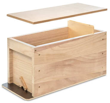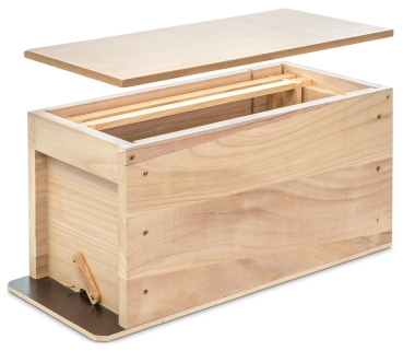 für 5 Rähmchen Normalmaß oder Zander, mit verschließbarem Flugloch, sowie vorder- und rückseitigen Griffleisten. Bei Normalmaß verbleibt Platz als Futterkammer. Gefertigt aus Vollholz mit MDF-Deckel. Außenmaß ca. 52 x 25 cm, Höhe 27 cm Gewicht ca. 4 kg