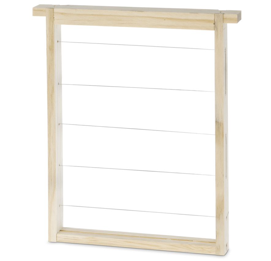 waagerecht gedrahtet, 10-fach geöst Holzstärke: Oberträger 27 x 20 mm Ohren auf 10 mm abgesetzt Breite rundum: 27 mm 241 mm x 285 mm je eine Nut oben und unten Preis pro Rähmchen Passend für Mini Plus Hochzarge, Art. 16311