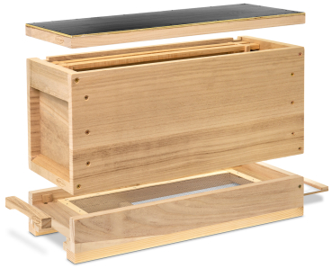 Bitte bestellen SIe zusätzlich zwei Kork-Plättchen (Art. 24472) zum Verschließen der beiden Auskerbungen an der Längsseite, wenn Sie zwei Vertikel Halbzargen übereinander als Ablegerkasten verwenden möchten.