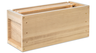 Bitte bestellen SIe zusätzlich zwei Kork-Plättchen (Art. 24472) zum Verschließen der beiden Auskerbungen an der Längsseite, wenn Sie zwei Vertikel Halbzargen übereinander als Ablegerkasten verwenden möchten.