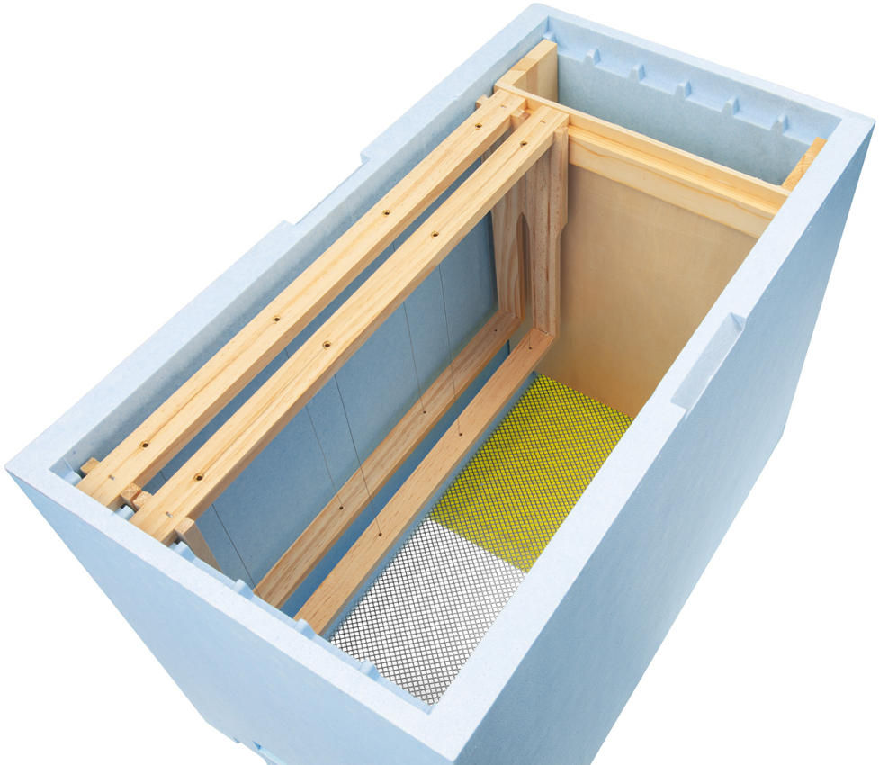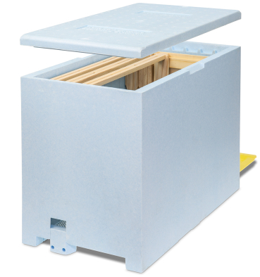 aus Hartschaum, für 6 Rähmchen Normalmaß 394 x 223 mm, mit Holz-Einengschied, mit Lüftungsgitter von 41,5 x 17,5 cm, Plastik-Bodenschieber und zwei verschließbaren Fluglöchern. Außenmaß 49,5 x 27,5 cm, Höhe 37 cm Auslieferung werksseitig in hellblau