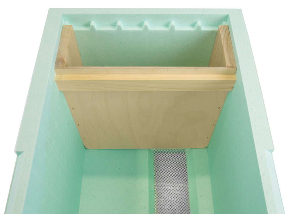 aus Hartschaum, für 6 Rähmchen Normalmaß 394 x 223 mm, mit Holz-Einengschied, Lüftungsgitter von 32 x 6,5 cm und verschließbarem Flugloch Außenmaß 50,5 x 27,5 cm, Höhe 32,5 cm Auslieferung werksseitig in mintgrün