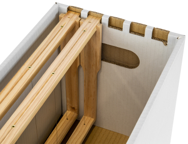 aus bewachstem Wellpappkarton, mit Kunststoff-Lüftungsgittern in den umklappbaren Griffaussparungen und einem Flugloch mit Fluglochschieber. Passend für 5 Rähmchen Dadant US Brut
