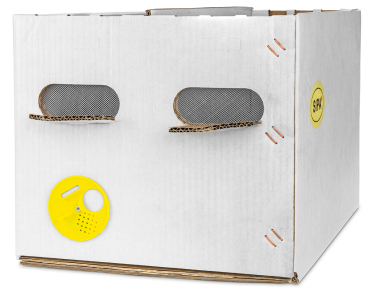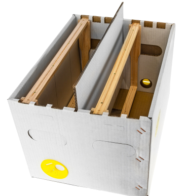 aus bewachstem Wellpappkarton, mit Kunststoff-Lüftungsgittern in den umklappbaren Griffaussparungen und zwei Fluglöcher mit Fluglochschieber. Passend für 6 Rähmchen Dadant US Brut