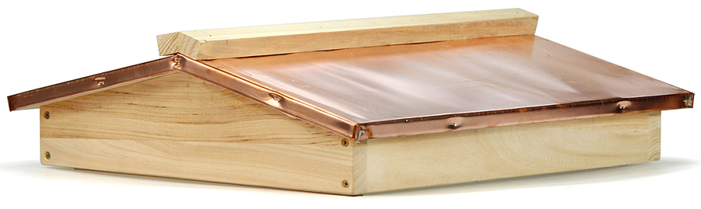massive Holzdächer, astfrei und unbehandelt. Mit Kupferbeschlag und umlaufendem Dachüberstand. Besonderheit: Zusätzliche Zierleiste auf dem Dachfirst Außenmaß 51 x 47 cm, Höhe ca. 13 cm, Gewicht ca. 4 kg