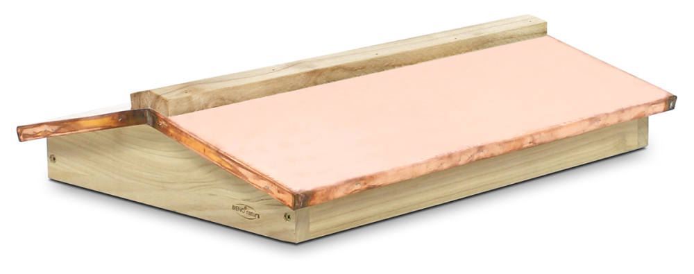 massive Holzdächer, astfrei und unbehandelt. Mit Kupferbeschlag und umlaufendem Dachüberstand. Besonderheit: Zusätzliche Zierleiste auf dem Dachfirst Außenmaß 59,5 x 45 cm, Höhe ca. 13 cm, Gewicht ca. 4 kg