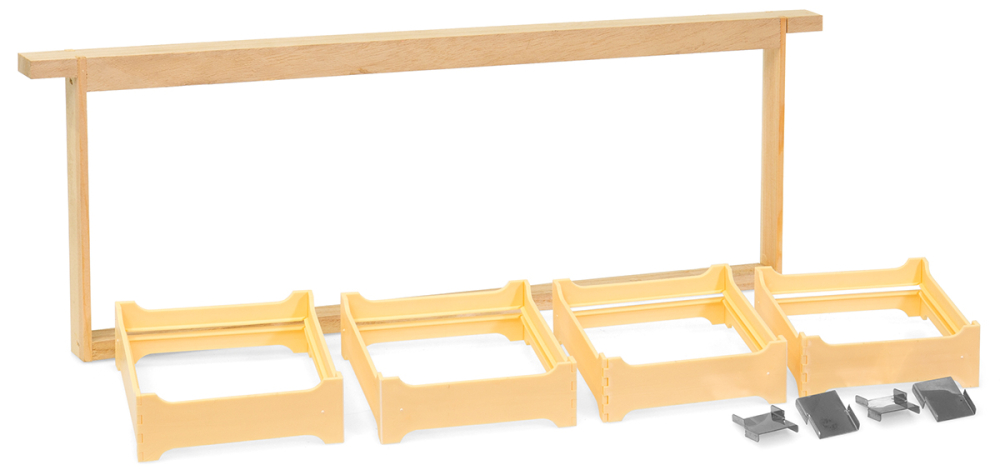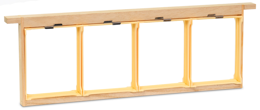 bestehend aus einem Wabenhonig-Rähmchen 477 x 159 mm Art. 30483, vier Nicot Wabenhonig-Rähmchen Art. 3045 und vier Edelstahl-Halterungen Art. 3047