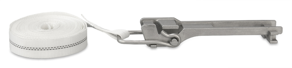 mit Stahl-Spannbügel Typ „Ludhof“, mit 22 mm breitem Spanngurt aus Polyester. Einfache Handhabung: Durch das Umklappen des Bügels ist der Gurt straff und sicher gespannt 5 m lang, für bis zu 6 Zargen