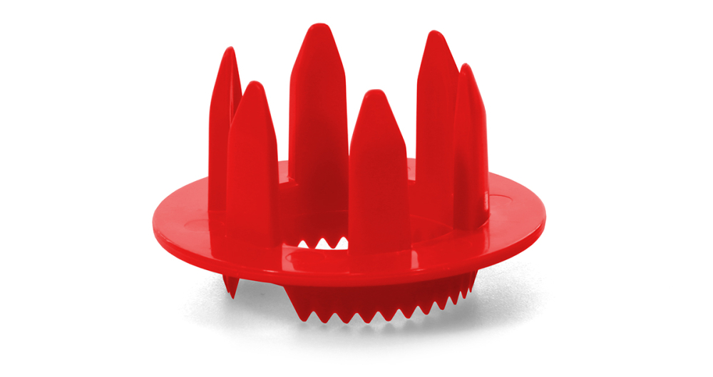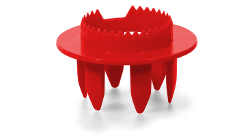 aus Kunststoff, mit der Stanze wird ein ca. 3,5 cm großes Loch in die Folie des Futterteigpakets "gefräst", danach wird die Teigfutter-Hilfe gedreht und in die Öffnung gedrückt. Die Abstandhalter verhindern das Zuklappen der Folie.