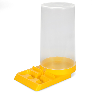 mit transparenter Futterglocke und 7,5 cm langer / 11,5 cm breiter Zunge mit Treppenaufstiegen, es können ein oder mehrere Kunststoff-Fütterer nebeneinander durch das Flugloch eingeschoben werden Maße: Länge ca. 18 cm, Breite ca. 11,5 cm, Höhe ca. 21 cm, Inhalt 1,25 Liter