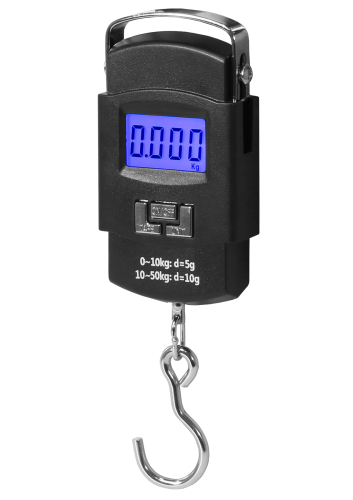 Zugwaage bis zu 50 kg mit beleuchtetem, digitalem Display. Ausgestattet mit verstellbarem Metallbügel und Tara-Ausgleich. Betrieb mit zwei AAA 1,5 V Batterien, im Lieferumfang enthalten. Wägebereich bis 10 kg in 5 g und von 10 bis 50 kg in 10 g Schritten Größe 11 x 6 x 2 cm