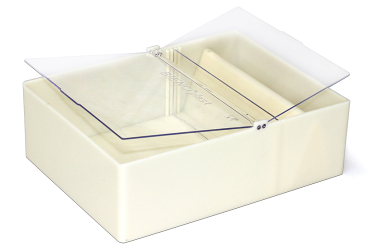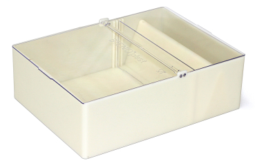 aus lebensmittelechtem Kunststoff mit seitlichem Aufstieg, verstellbarem Futtersteg und aufklappbaren Klarsicht-Scharnier-Deckeln für flüssiges und festes Futter Außenmaß ca. 250 x 185 x 80 mm