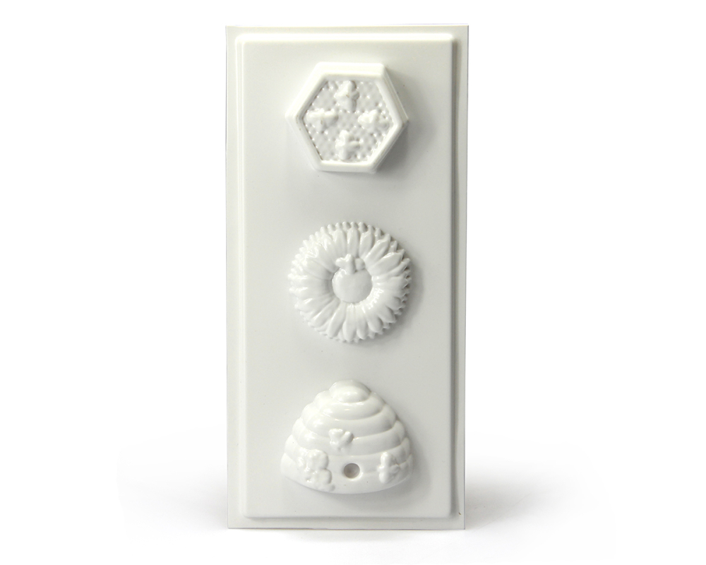 aus Kunststoff, für 3 Formen (Wabe, Blume, Bienenkorb). Zum Gießen von Seife oder Bienenwachs geeignet. Außenmaß: ca. 27 x 13 cm