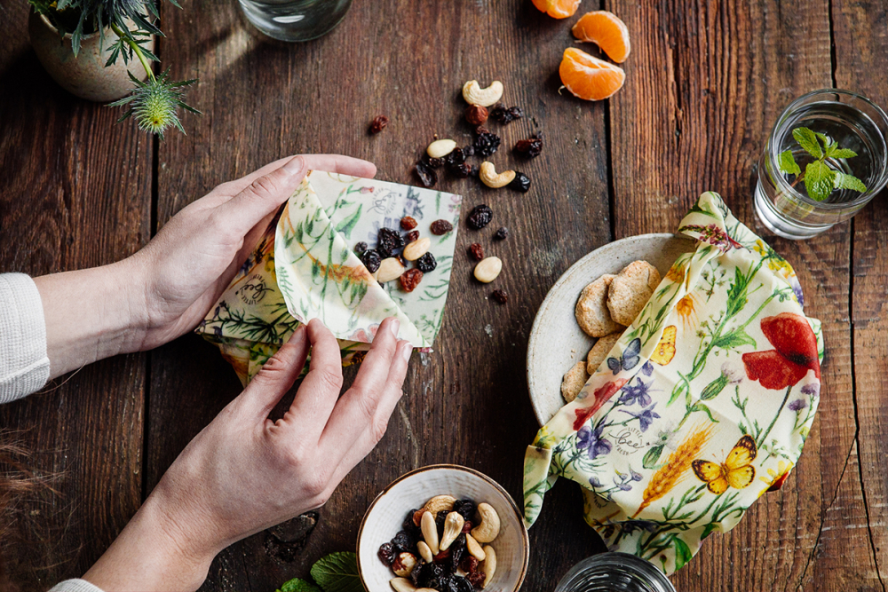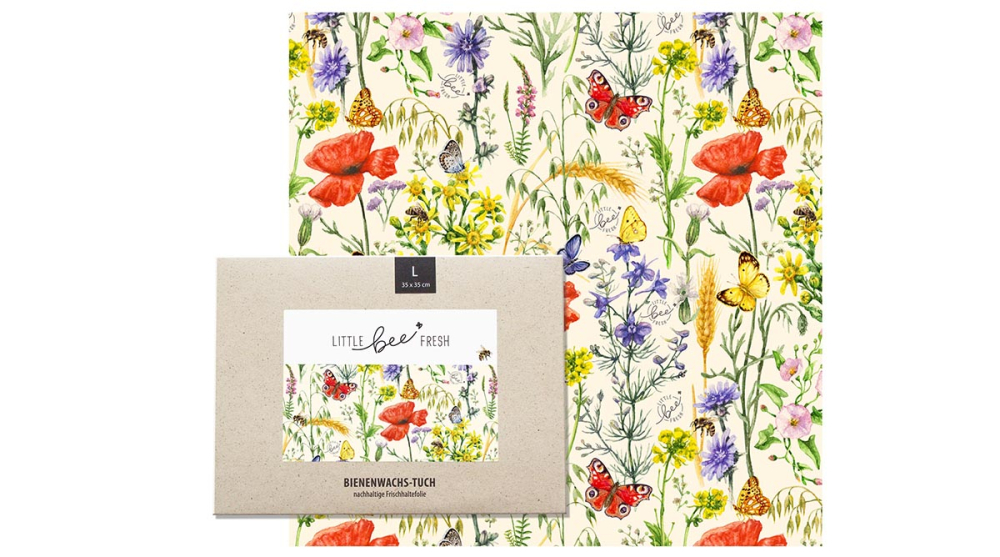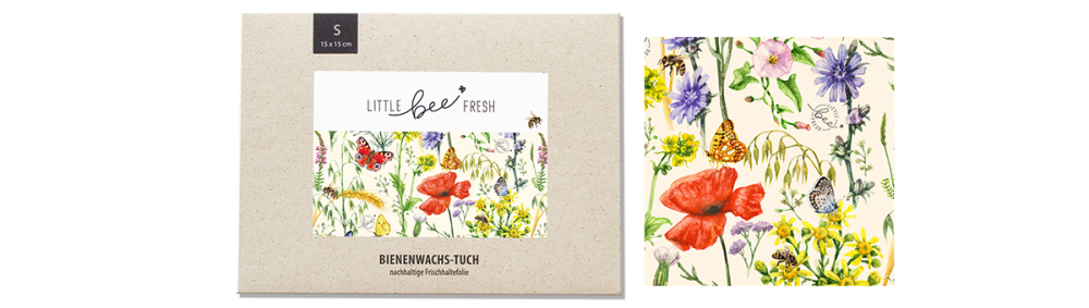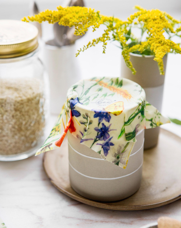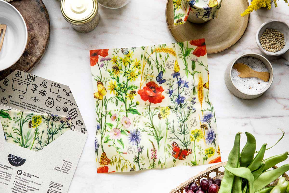 Bienenwachs-Tuch als nachhaltige Frischhaltefolie für Gemüse, Früchte oder Brot und zum Abdecken von Schüsseln. Hergestellt mit Deutschem Bienenwachs und wiederverwendbar