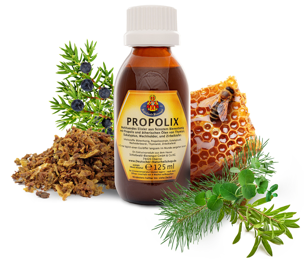 Wohltuendes Elixier aus Bienenhonig, Propolis und ätherischen Ölen von Thymian, Eukalyptus, Wacholder und Zirbelkiefer Flasche mit 125 ml