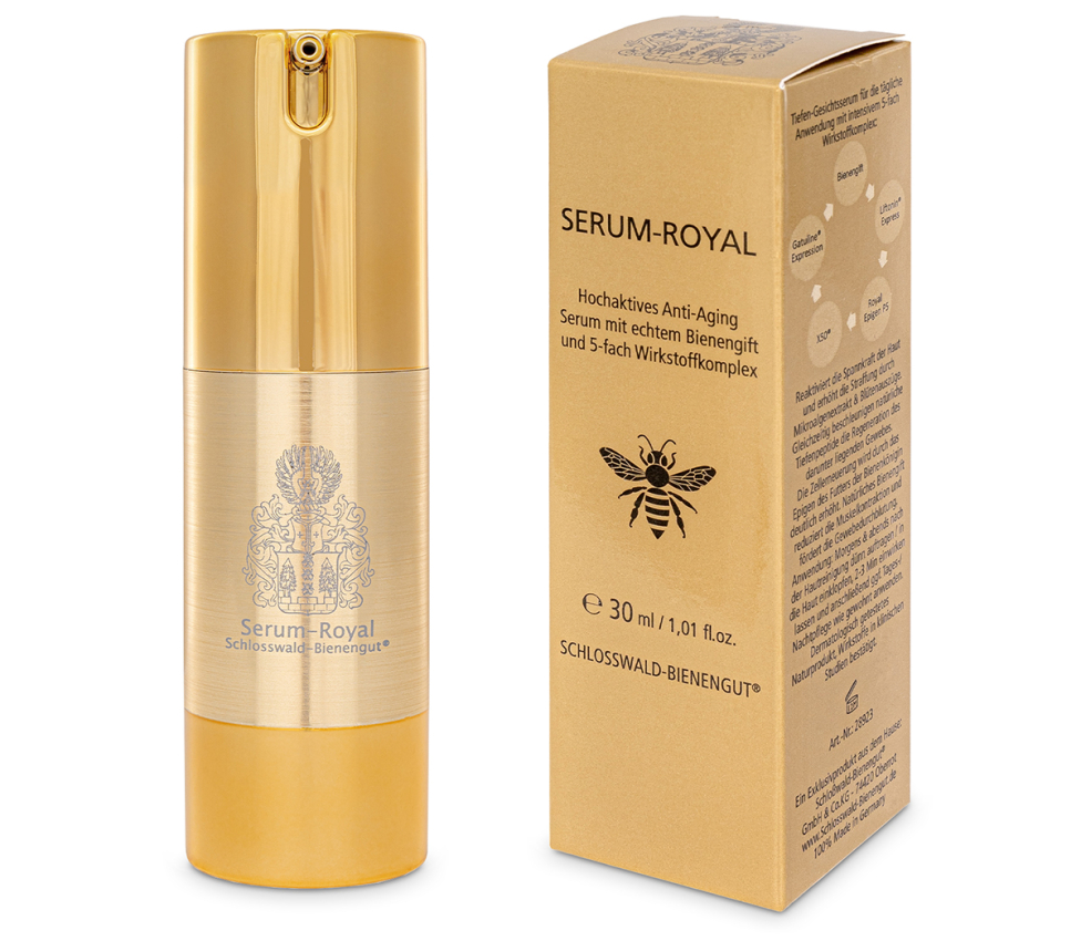 Hochaktives Anti-Aging Tiefen Gesichtsserum für die tägliche Anwendung mit echtem Bienengift und 5-fach Wirkstoffkomplex. Reaktiviert die Spannkraft der Haut und erhöht die Straffung durch Mikroalgen-Extrakt und Blüten-Auszüge. Gleichzeitig beschleunigen natürliche Tiefen-Peptide die Regeneration des darunter liegenden Gewebes. Die Zellerneuerung wird durch das Epigen des Futters der Bienenkönigin deutlich erhöht. Naturreines Bienengift reduziert die Muskelkontraktion und fördert die Gewebe-Durchblutung Vakuum-Pump-Spender mit 30 ml