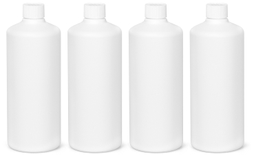 bestehend aus 4 Plastikflaschen 1 Liter weiß, aus HDPE, mit 25 mm Gewinde und weißem Drück- und Dreh-Verschluss mit Schaumeinlage. In Fundgrube, da Sonderserie