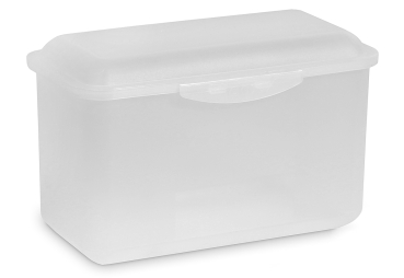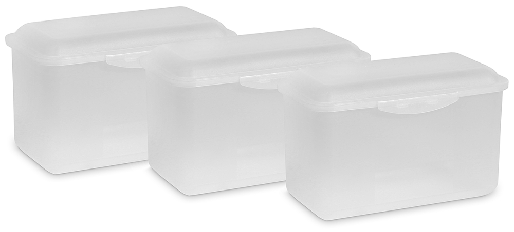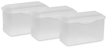 bestehend aus drei transparenten Kunststoffdosen mit Klickverschluss. Einzelmaß: 20 x 10 cm, Höhe 12,5 cm In Fundgrube, da Sonderserie