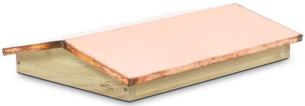 massiv und aus astfreiem Holz und mit umlaufendem Dachüberstand. Besonderheit: Die Kupferabdeckung ist aus einem Stück hergestellt und nicht durch eine Mittelnaht durchtrennt. Außenmaß 59,5 x 45 cm, Höhe 12 cm, Gewicht ca. 3,8 kg In Fundgrube, da 2. Wahl