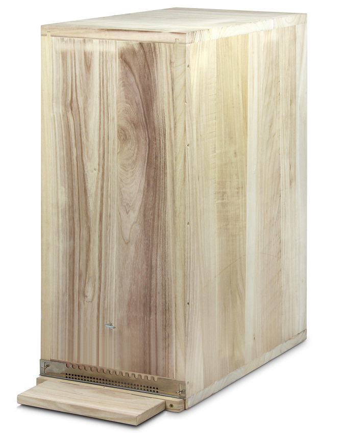 Grundkorpus in einem Stück, ausgestattet mit einer schwenkbaren Hecktür und vier Etagen mit 8 Edelstahl-Schienen. Variabel nutzbar z.B. für zwei Etagen mit Schw. Brutrahmen oder einer Etage mit Brut- und zwei Etagen mit Honigrahmen oder mit vier Etagen Honigrahmen.