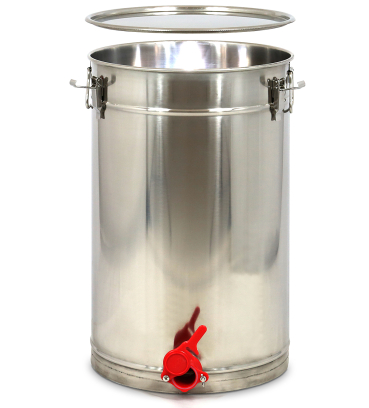aus Edelstahl, mit Spannverschlussdeckel, Kunststoff-Quetschhahn 1 1/5 Zoll, bodengleichem Auslauf und Kegelboden. Ø 41 cm, Höhe: 64 cm, Gewicht ca. 4,5 kg In Fundgrube, da Sonderserie