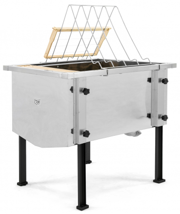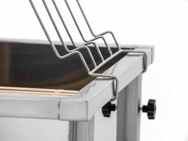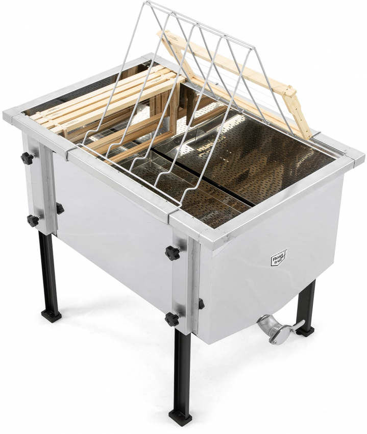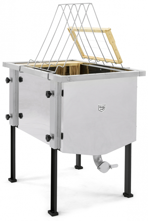 passend für Dadant US und Langstroth Rähmchen mit einem Oberträger von 482 mm bis zu einer Höhe von 400 mm. Hergestellt aus Edelstahl, mit einem Wabenhalter zum Entdeckeln im Stehen und nachfolgendem Einhängen in den 48,5 cm breiten Raum des Tisches. Der nivellierbare Tisch verfügt über einen konischen Schrägboden mit Edelstahl-Quetschhahn von 23 cm Höhe, sowie einen herausnehmbaren Siebbehälter Tischhöhe 80 cm, Größe: 107 x 60 x 120 cm Gewicht ca. 24 kg