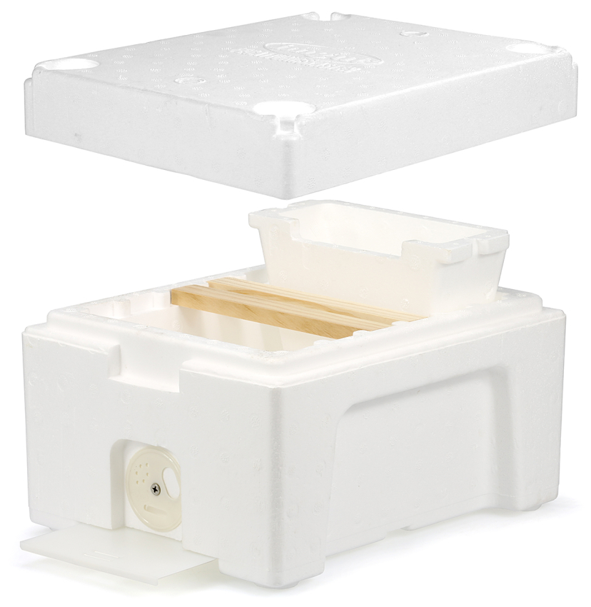 mit herausnehmbarer Futterkammer, Bodenschieber und runder Fluglochrosette sowie einem fest verschließbarem Deckel. Aussparung passend für vier bis sechs Rähmchenleisten (nicht im Lieferumfang enthalten)