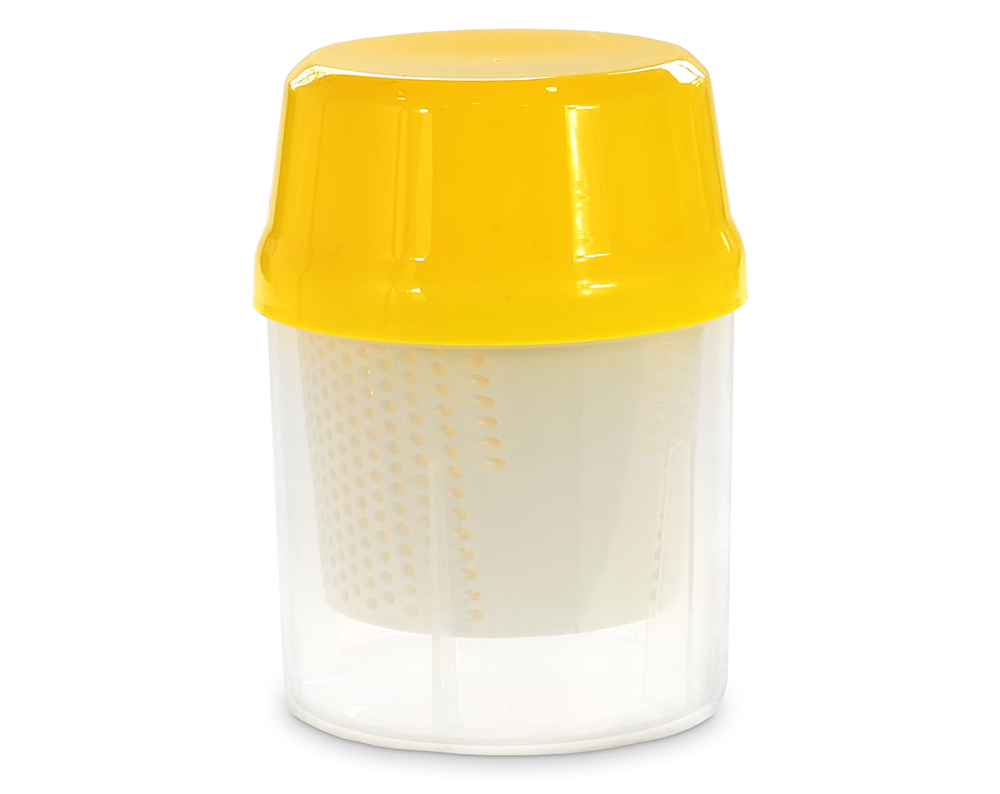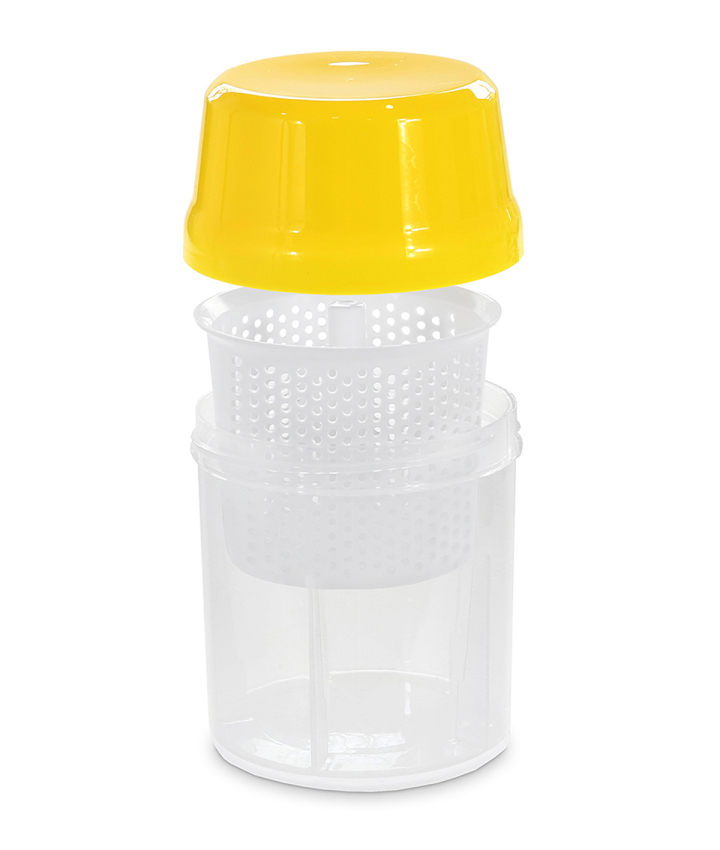 bestehend aus einem transparenten Kunststoff-Schüttelbecher mit Siebeinsatz, einem Schraubdeckel und Anleitung. Zur Kontrolle des Varroamilben-Befalls, passend für ca. 200 - 300 Bienen. Ø ca. 10,5 cm, Höhe 14 cm In Fundgrube, da Sonderposten