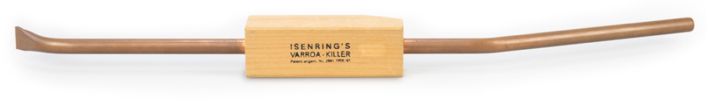 bestehend aus einem Verbrennungsrohr aus Kupfer mit handlichem Holzgriff. Durch Erhitzen des Kupferrohrs erfolgt die Verdampfung. Die Öffnung des Kupferrohrs wird in das Flugloch gesteckt, sodass der geschlossene Teil des Rohrs nach unten zeigt.