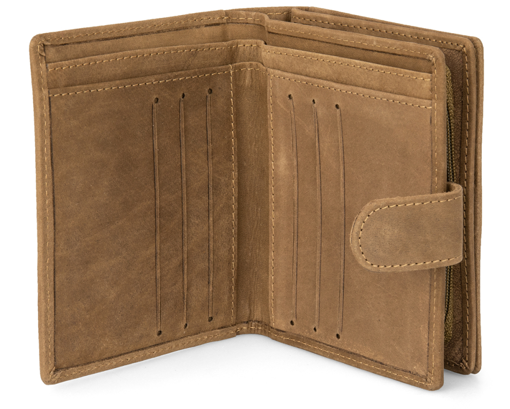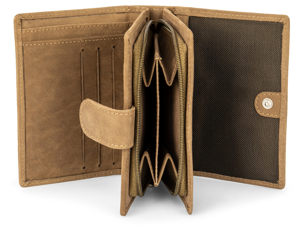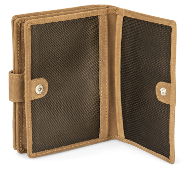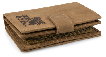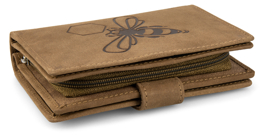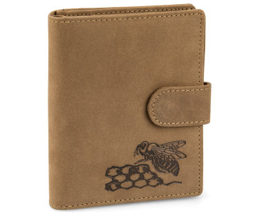 hergestellt aus geschliffenem Rindsleder mit beidseitig geprägtem Bienenbild. Ausgestattet mit zwei großen Geldscheinfächern, einem Doppel-Münzfach mit Reißverschluss, vier Dokumentenfächern und sechs Kartenfächern mit zusätzlichem Druckverschluss Größe ca. 12 x 9,5 x 2,5 cm