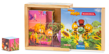Das klassische Würfelpuzzle aus Holz im Schubkistchen mit beliebten Motiven von Maja und ihren Freunden. Insgesamt 9 Teile ca. 13 x 5 x 13 cm