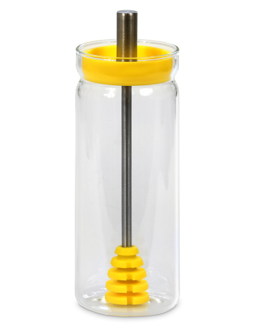 Honigdose aus Glas, Silikondeckel und Honignehmer mit Edelstahlschaft, lebensmittelecht. Gesamthöhe ca. 18 cm, Ø 6,5 cm, Gewicht 200 g