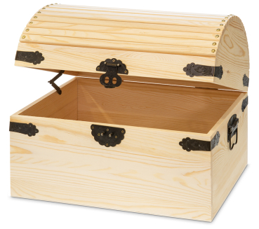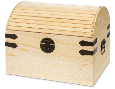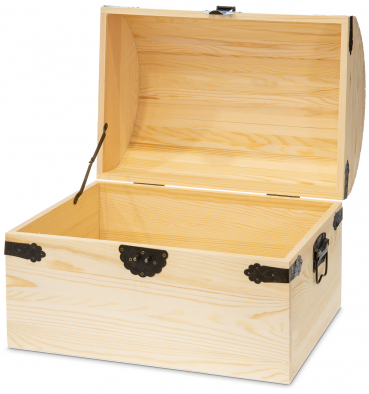 aus Holz mit Eckbeschlägen, Scharnieren und Tragegriffen aus verziertem Metall Außenmaß: 45 x 31,5 cm, Höhe 35 cm Holzstärke 12 mm