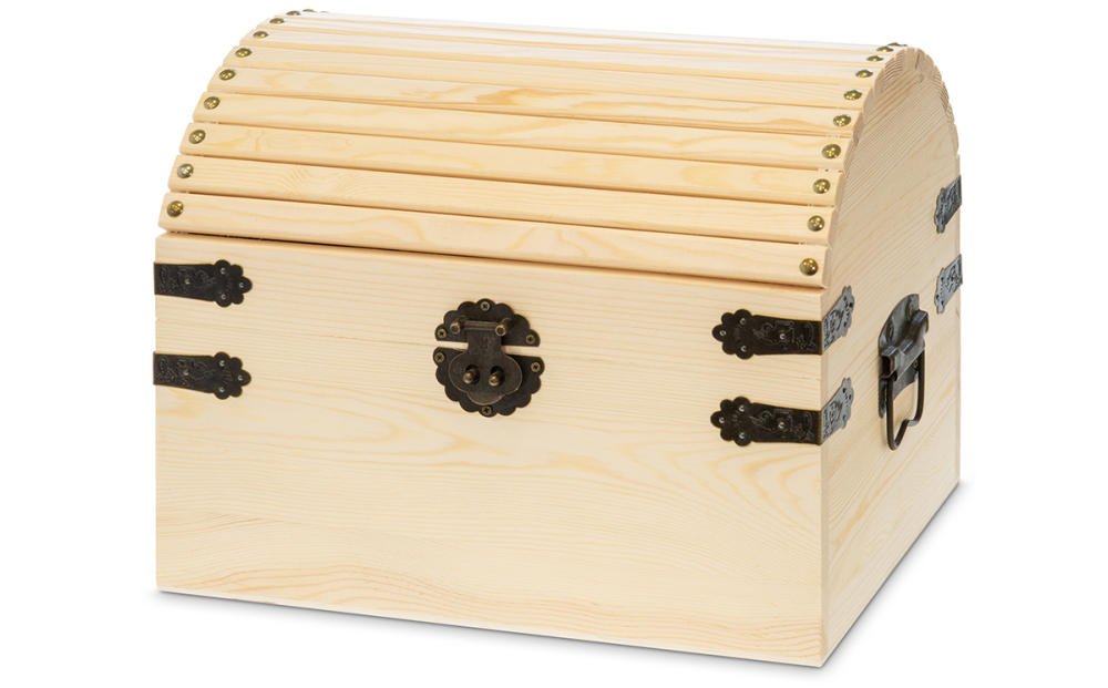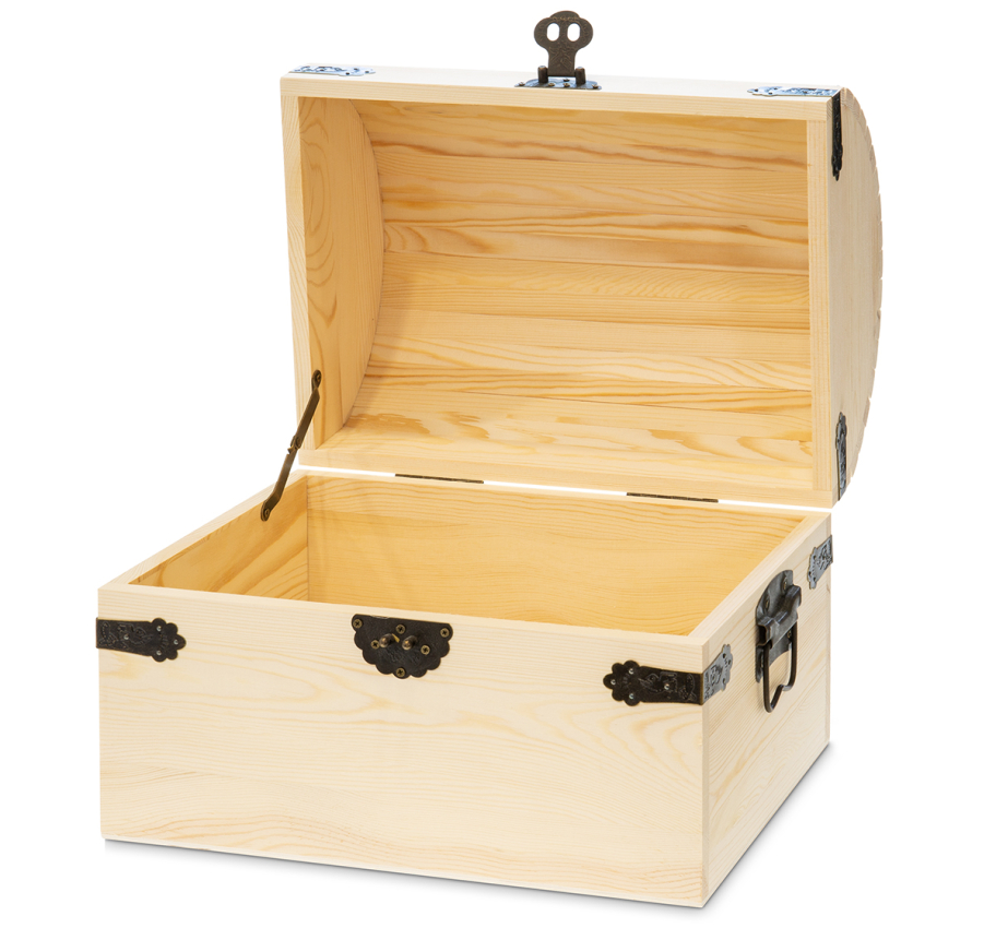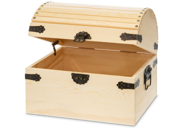 aus Holz mit Eckbeschlägen, Scharnieren und Tragegriffen aus verziertem Metall Außenmaß: 35 x 26 cm, Höhe 28 cm Holzstärke 12 mm
