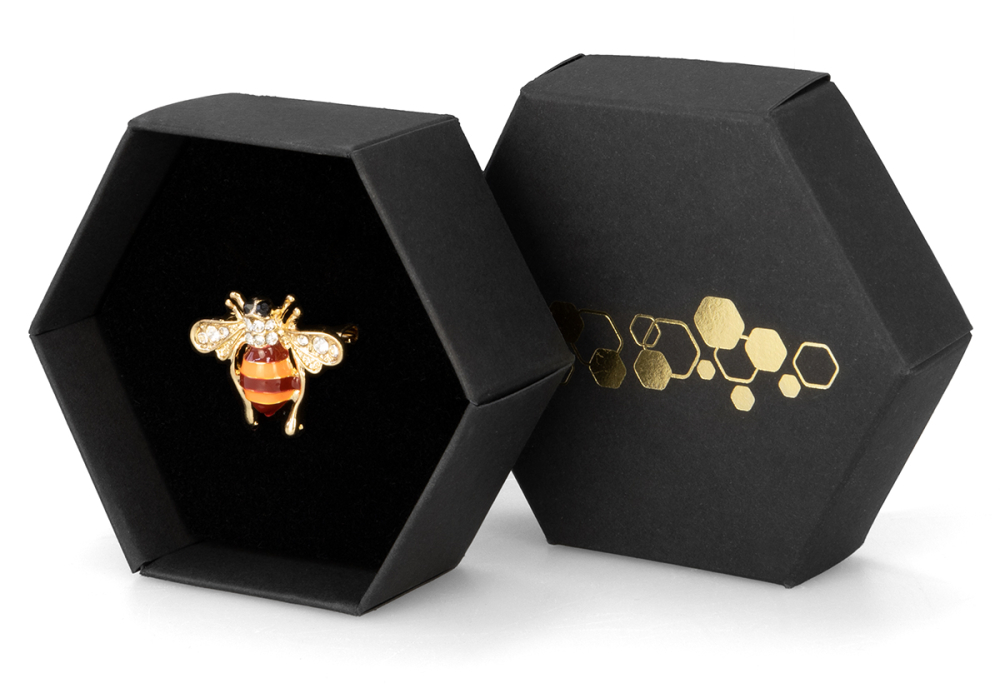 goldfarbene Bienenbrosche, mit rot-orangefarben gestreiftem Körper und mehreren kleinen, weißen Glitzersteinen besetzt. In schwarzer Waben-Schmuckschachtel, mit Schmucktüte Maße ca. 2,5 x 3 cm