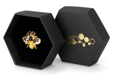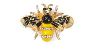 goldfarbene Bienenbrosche, der Bienenkörper ist gelb mit schwarzer Perle und die Streifen mit Glitzersteinen besetzt, die Flügel sind schwarz-weiß verziert. In schwarzer Waben-Schmuckschachtel, mit Schmucktüte Maße ca. 3,5 x 2,5 cm