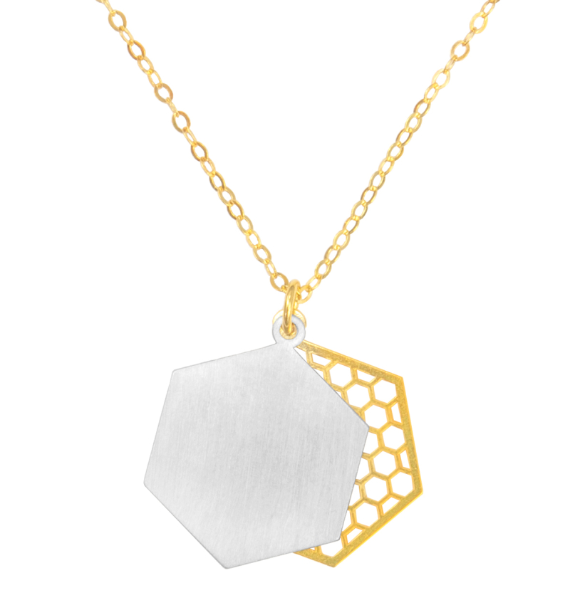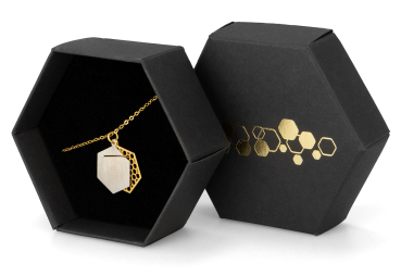 Halskette mit Doppel-Wabenanhänger. In schwarzer Waben-Schmuckschachtel, mit Schmucktüte Material: Silber 925, teilweise vergoldet Kettenlänge ca. 46 cm Anhängergröße ca. 1,8 x 1,8 cm