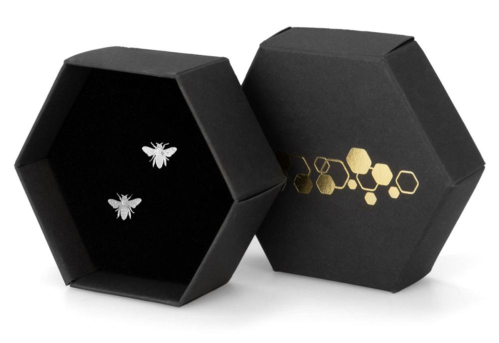 Ohrstecker in Bienenform. In schwarzer Waben-Schmuckschachtel, mit Schmucktüte Material: Silber 925 Größe ca. 0,8 x 1,3 cm