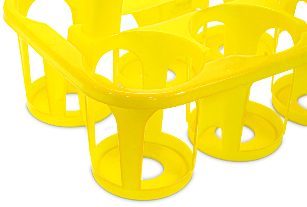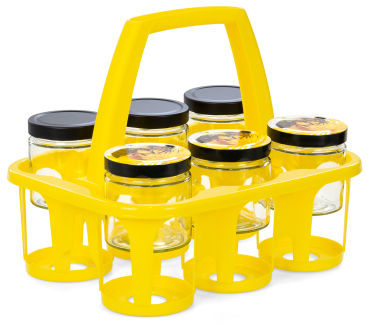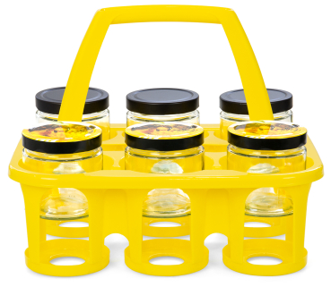 Stapelbarer Kunststoff-Tragekorb für den Transport von bis zu sechs Honiggläsern. Die Gläser sind durch Trennwände einzeln geschützt, sodass die Bruchgefahr auch ohne weitere Verpackung gemindert wird. Passend für Gläser von ca. 200 bis 900 ml oder einem Ø von 8,8 cm. Größe 34 x 26 cm, Höhe 27,5 cm