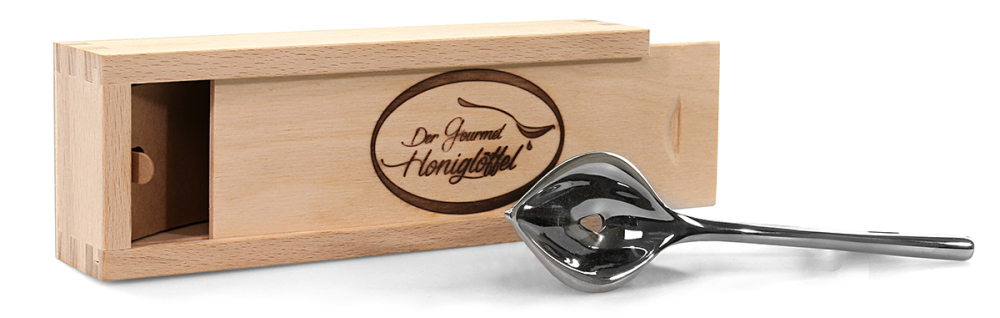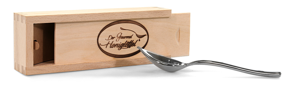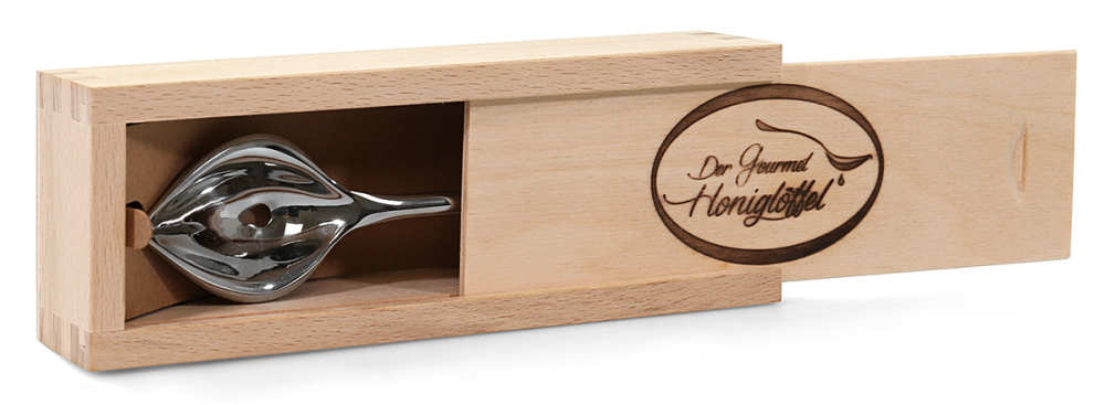 aus Edelstahl mit Ablagehaken, Rücklauf-Öffnung und Original Holzschatulle, Länge 14,5 cm, Gewicht 38 g