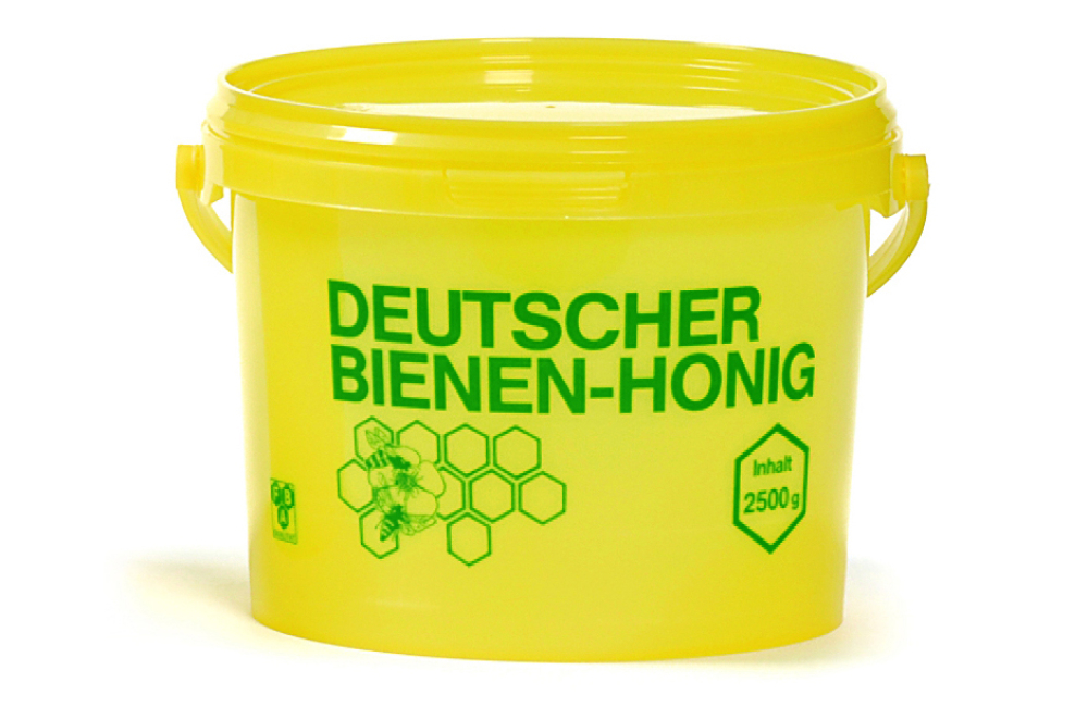 mit gelbem Deckel und grünem Aufdruck "Deutscher Bienenhonig" Höhe 13 cm, Ø oben 16, unten 14,5 cm