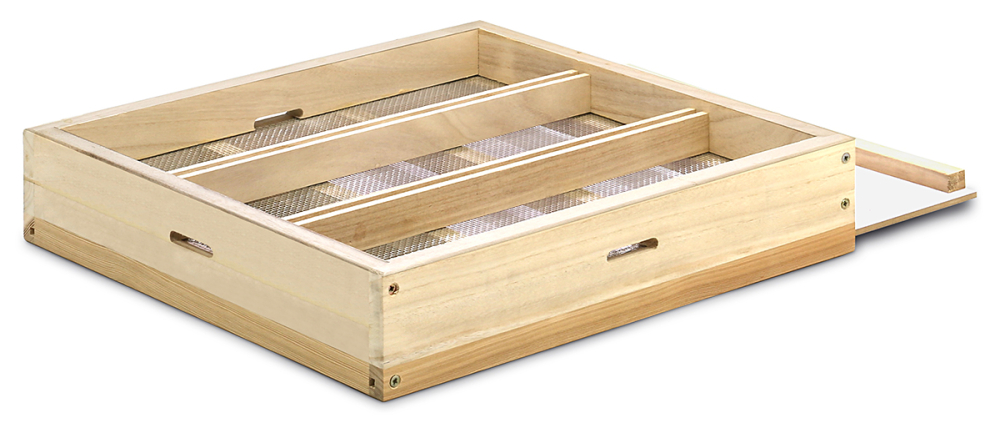 mit Edelstahl Varroagitter, Bodenschieber und drei Flug- löchern. Durch Einsatz der Trennschiede können bis zu drei Ableger in einer Zarge gebildet werden. Passend für Normalmaß, Höhe ca. 9 cm, Gewicht ca. 2,5 kg